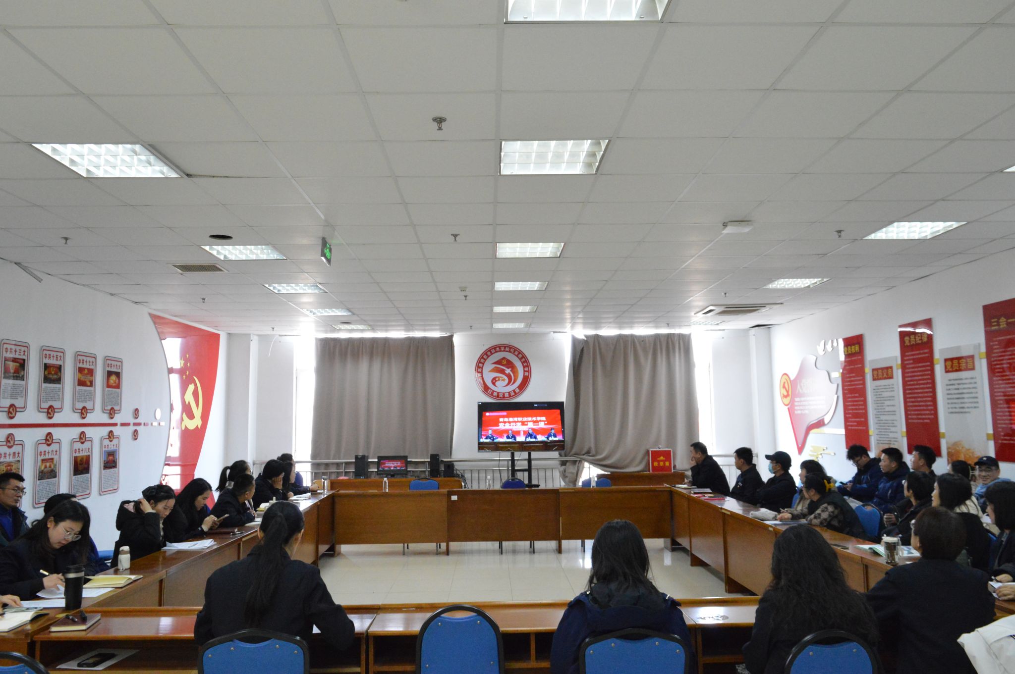 会议第一阶段集中开展安全开学“第一课”学习。全体教师共同观看直播,围绕校园安全、网络安全、行为规范等重点内容深入学习。杨丰鸿围绕防范电信诈骗、加强网络安全作专题讲解,提醒师生提高警惕、筑牢网络安全屏障。李卫东就大学生行为规范作出部署,提出物理隔离、强化时间管理、内部筛选、规范使用 AI 工具、严守法律与国家安全红线等具体措施。徐国旺就校园安全工作提出明确要求:一要提高政治站位,压实安全责任,树立底线思维,持续强化学生安全意识;二要绷紧安全之弦,严守安全底线,抓实消防安全演练;三要关注师生身心健康,做好情绪疏导,织密心理防线;四要规范言行举止,守牢舆情阵地,教师以身作则,引导学生树立正确三观;五要夯实主体责任,强化协同共治,营造安全、整洁、有序的校园环境。
