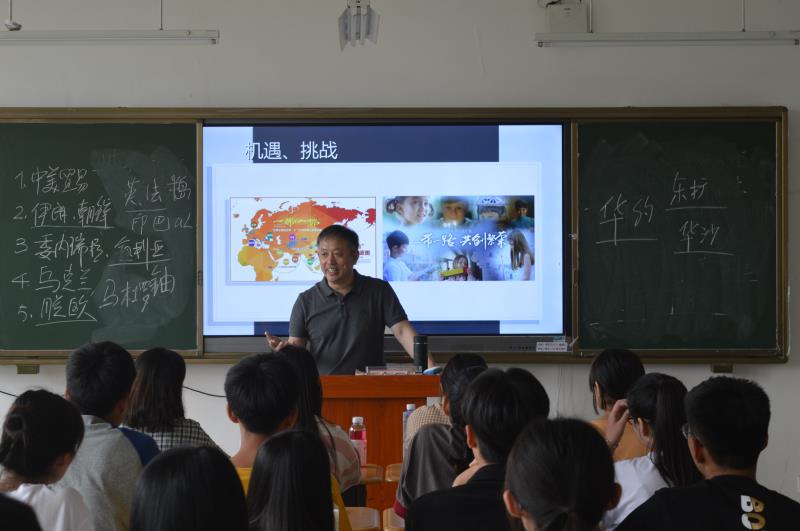 刘校长从传统文化“修齐治平”的思想导入课程,引导学生涵养“穷则独善其身”“达则兼济天下”的修养与胸襟,理论联系实际,用事实说话,说明大国之大,不在疆域、不在人口、不在经济,而在影响力,生动诠释了“大国之大”“大国外交”的深刻含义。接着刘校长重点讲析了中美贸易摩擦和当今世界区域热点问题,让学生了解美国“长臂管辖”的霸权主义本质,通过中国外交故事,生动展现了中国坚持以维护世界和平、促进共同发展为宗旨推动构建人类命运共同体的诚心和信心,彰显出大国外交中的中国智慧与担当,显现出中国外交鲜明的中国特色、中国风格与中国气派。教学小结,刘校长把宋代朱熹的《劝学诗/偶成》送给学生:“少年易老学难成,一寸光阴不可轻。未觉池塘春草梦,阶前梧叶已秋声。”勉励广大学子在最美好的青春年华里,放下手机,走出宿舍,多读书,多运动,养成受益终身的学习习惯和生活习惯,在独立思考中,培养科学的思维方法。课间休息时间,刘校长和学生一起畅谈学习、趣谈生活,师生之情,其乐融融。