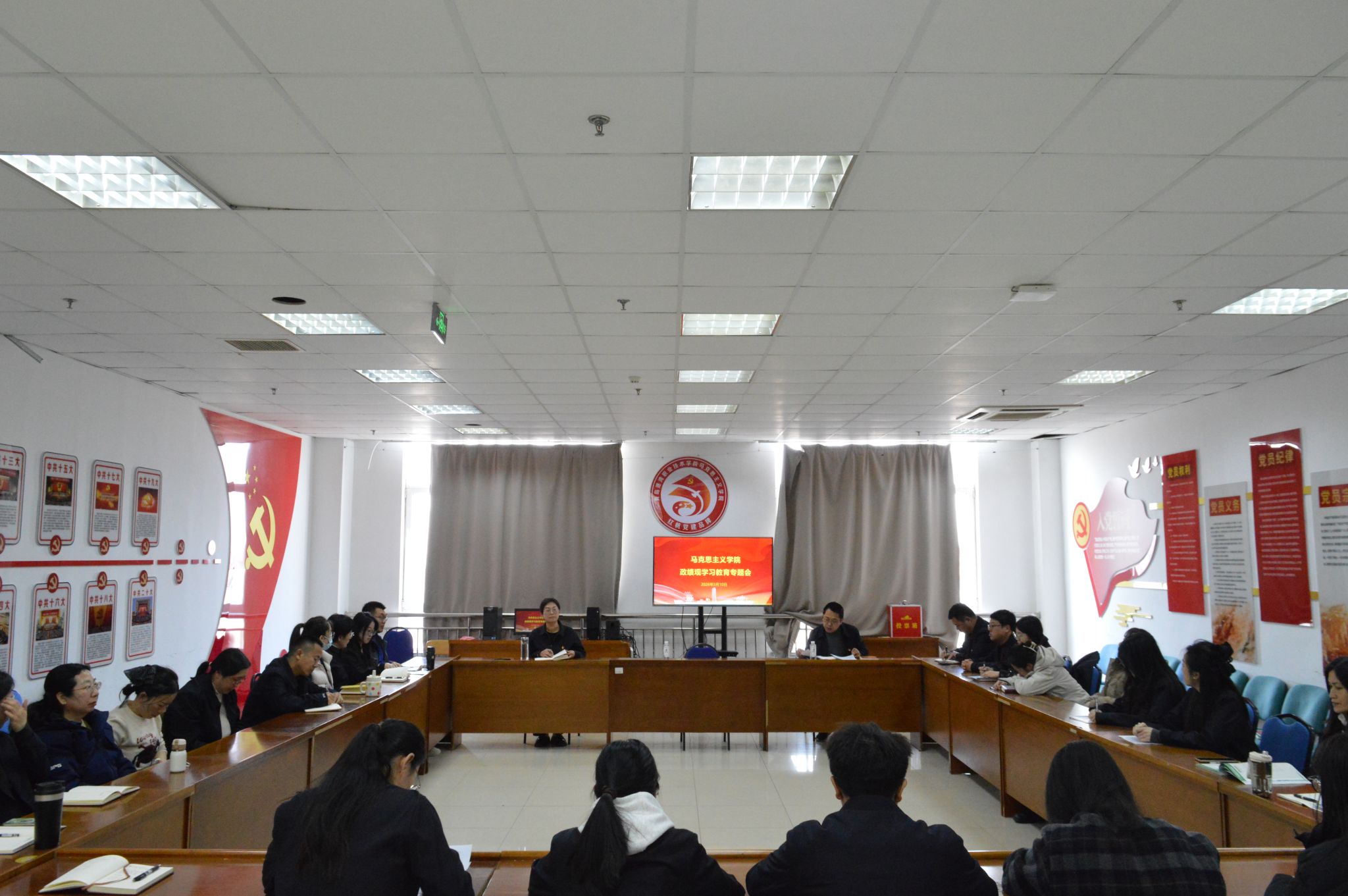 会议第二阶段开展政绩观学习教育。刘洪新指出,开展政绩观学习教育,旨在统一思想、凝聚共识,更好完成新学期各项工作任务。彭翠介绍学院 “十百千” 任务目标,号召全体教师凝心聚力、协同攻坚。刘洪新进一步强调,要打破畏难情绪、坚定发展信心,树立和践行正确政绩观,深刻认识到政绩观教育是全面从严治党、加强干部队伍建设的重要举措。作为思政教师,要以正确政绩观指导育人实践,牢记 “功成不必在我,功成必定有我”,勇担立德树人使命。