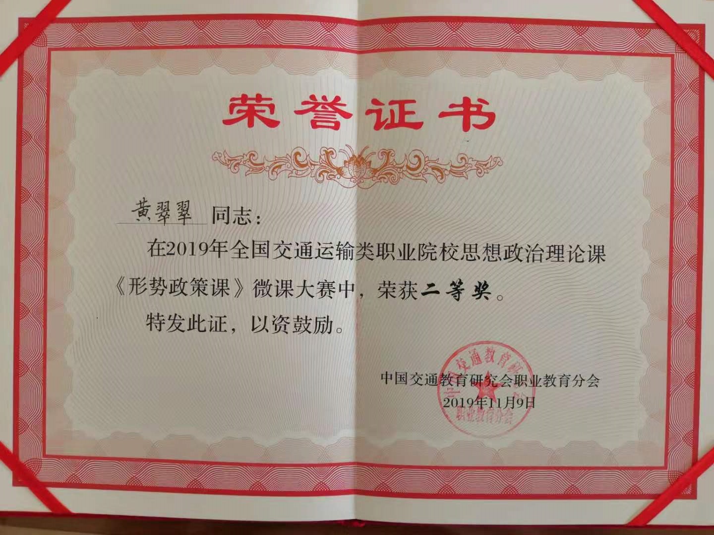 近日,由中国交通教育研究会职教分会思想政治工作委员会主办、陕西交通职业技术学院承办的“2019年全国交通运输类职业院校思想政治理论课《形势与政策》微课大赛”的现场展示决赛在陕西西安举行,我院思政部教师黄翠翠代表学院参赛。