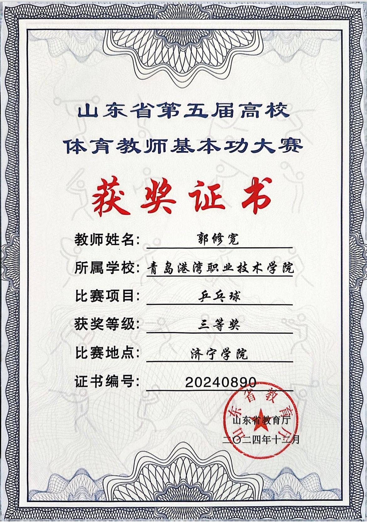 近日,山东省第五届高校体育教师基本功大赛在曲阜圆满举行。此次大赛吸引了来自全省155所高校的1940名体育教师同台竞技,展示了各高校体育教师的教学技能和竞技水平。我院共有两位体育教师在此次大赛中荣获佳绩。