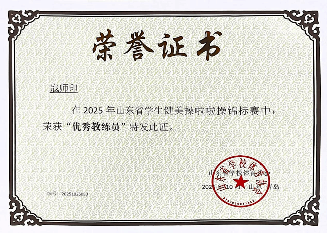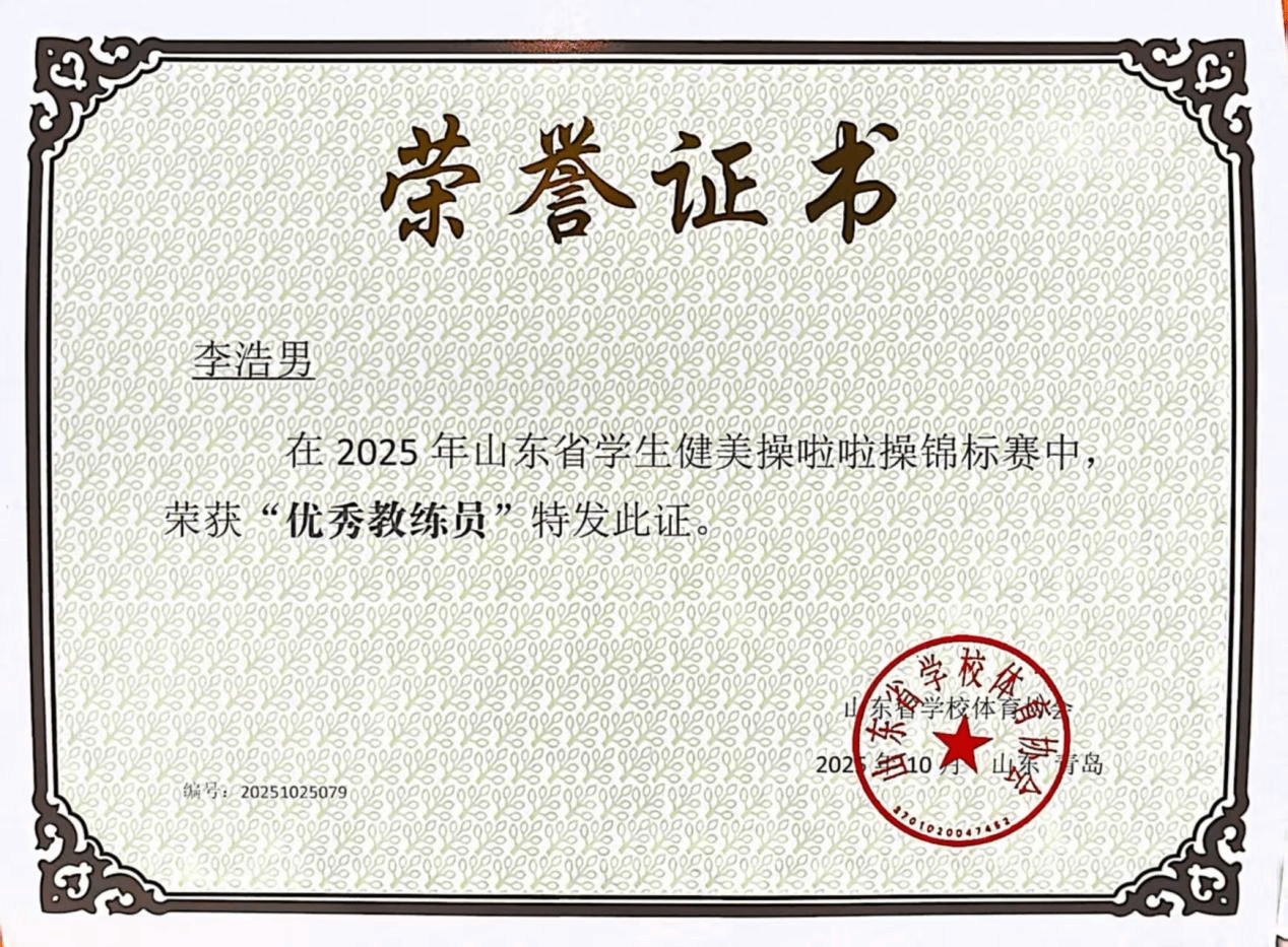 近日,2025年山东省学生健美操、啦啦操锦标赛在青岛落下帷幕。bw必威西汉姆联代表队在比赛中表现卓优秀,一举夺得三个项目的第一名,李浩男、寇师印两位指导教师荣获“优秀教练员”称号。