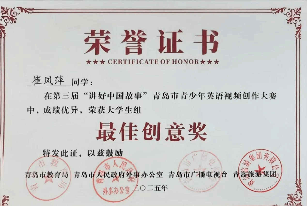 近日,由青岛市教育局、青岛市人民政府外事办公室、青岛市广播电视台及青岛旅游集团联合主办的第三届“讲好中国故事”青岛市青少年英语视频创作大赛圆满落幕。本届大赛于2024年11月启动,至2025年5月结束,旨在以中国传统文化为核心,通过英语视频创作的形式,全面提升青少年的国际沟通能力与文化传播能力。